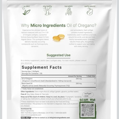 El Aceite de Orégano con Semilla Negra de Micro Ingredients une dos ingredientes poderosos en una sola cápsula: el orégano (Origanum minutiflorum), rico en carvacrol, y la semilla negra (Nigella sativa), reconocida por su timoquinona.