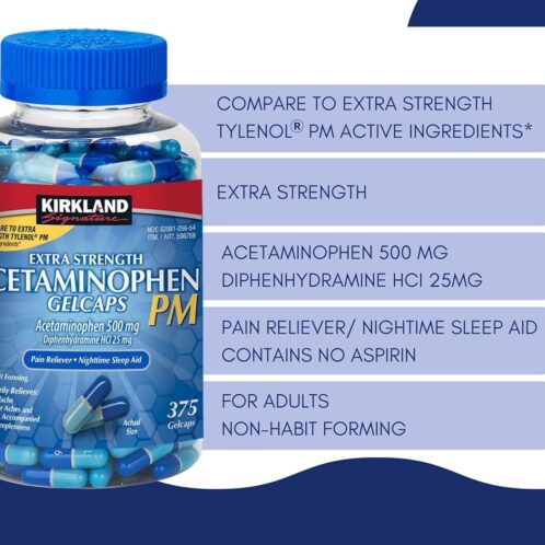 Kirkland Acetaminophen PM es una fórmula de alta potencia diseñada para aliviar el dolor leve a moderado mientras ayuda a conciliar el sueño. Combina 500 mg de acetaminofén con 25 mg de difenhidramina HCl, un antihistamínico con efecto sedante, ideal para quienes enfrentan molestias físicas que interrumpen el descanso.