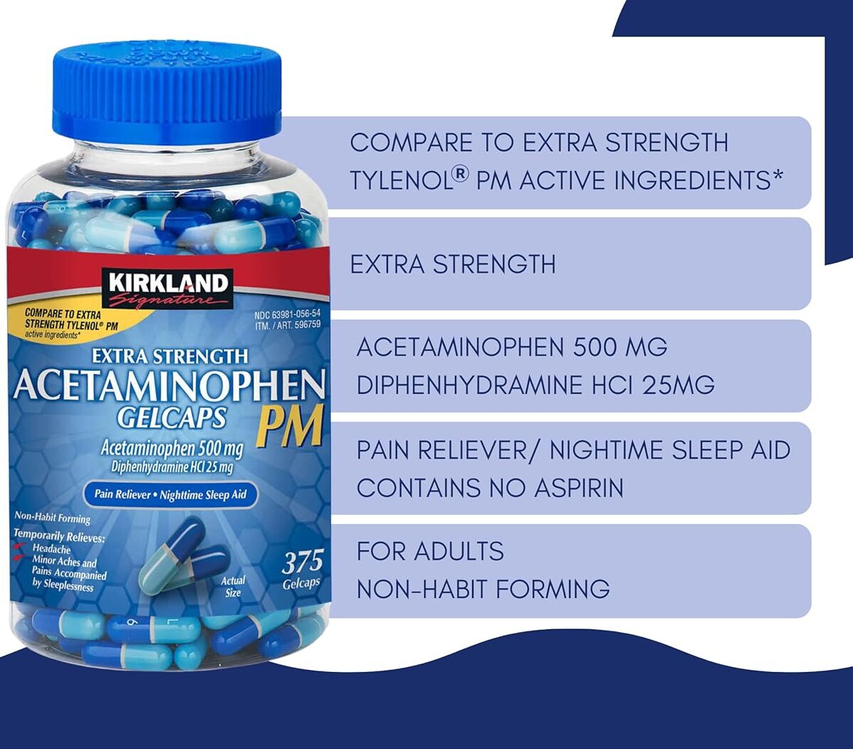 Kirkland Acetaminophen PM es una fórmula de alta potencia diseñada para aliviar el dolor leve a moderado mientras ayuda a conciliar el sueño. Combina 500 mg de acetaminofén con 25 mg de difenhidramina HCl, un antihistamínico con efecto sedante, ideal para quienes enfrentan molestias físicas que interrumpen el descanso.