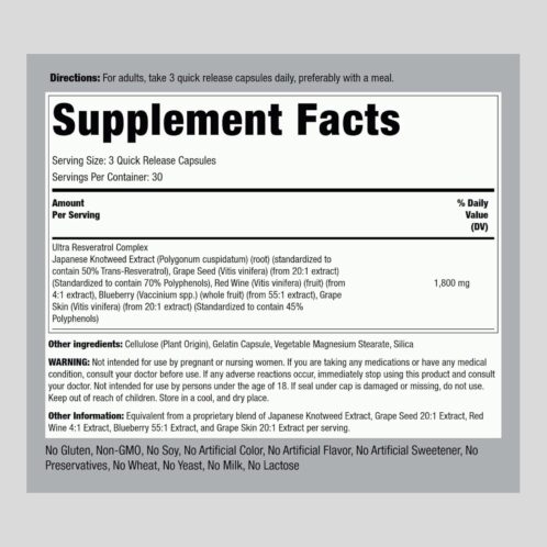 Nuestro Ultra Resveratrol Complex ofrece una fórmula poderosa diseñada para apoyar tu bienestar general. Elaborado sin ingredientes genéticamente modificados (sin OMG) y libre de gluten, este suplemento viene en cápsulas de liberación rápida que facilitan su absorción. Cada lote ha sido probado en laboratorio para garantizar calidad y pureza, utilizando solo ingredientes confiables.