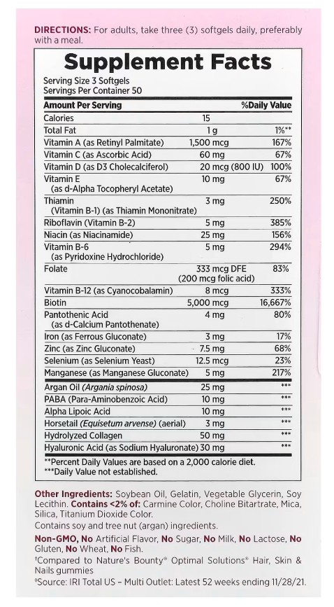 Cada porción de estas cápsulas suaves contiene vitaminas antioxidantes A, C y E, además de ácido hialurónico y biotina, que contribuyen al cuidado y mantenimiento de un cabello, una piel y unas uñas saludables.