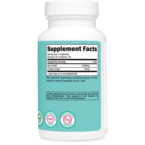 Cada botella contiene 120 cápsulas, suficientes para 30 porciones. Cada porción aporta 2000 mg de Myo-inositol y 50 mg de D-Chiro-inositol. El suplemento es apto para vegetarianos, libre de OGM y sin gluten. Ha sido probado por terceros en laboratorios acreditados por ISO y se fabrica en una instalación registrada por la FDA que cumple con las Buenas Prácticas de Fabricación (BPF).