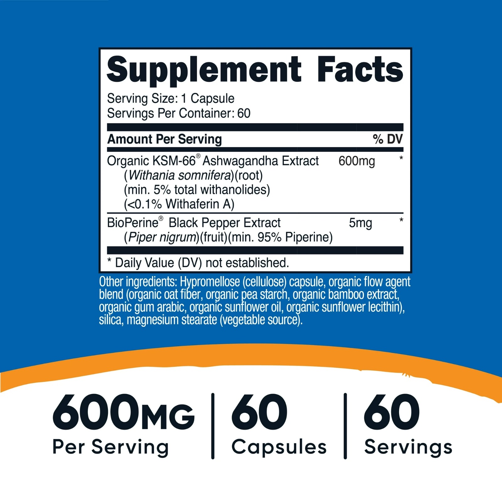 Cada cápsula vegetariana contiene 600 mg de Ashwagandha KSM-66® con un potente 5% de withanólidos (30 mg), más BioPerine® para mejorar su absorción y efectividad.